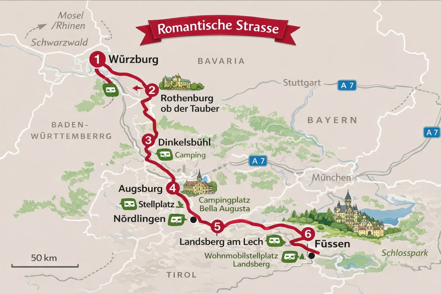 Romantische Strasse i autocamper er en ideel rejse for dig, der ønsker autentiske byoplevelser, historiske slotte, vinmarker og idylliske landskaber samlet på én sammenhængende rute. Ruten strækker sig over ca. 400 km gennem hjertet af Bayern og forbinder nogle af Tysklands smukkeste og bedst bevarede middelalderbyer.